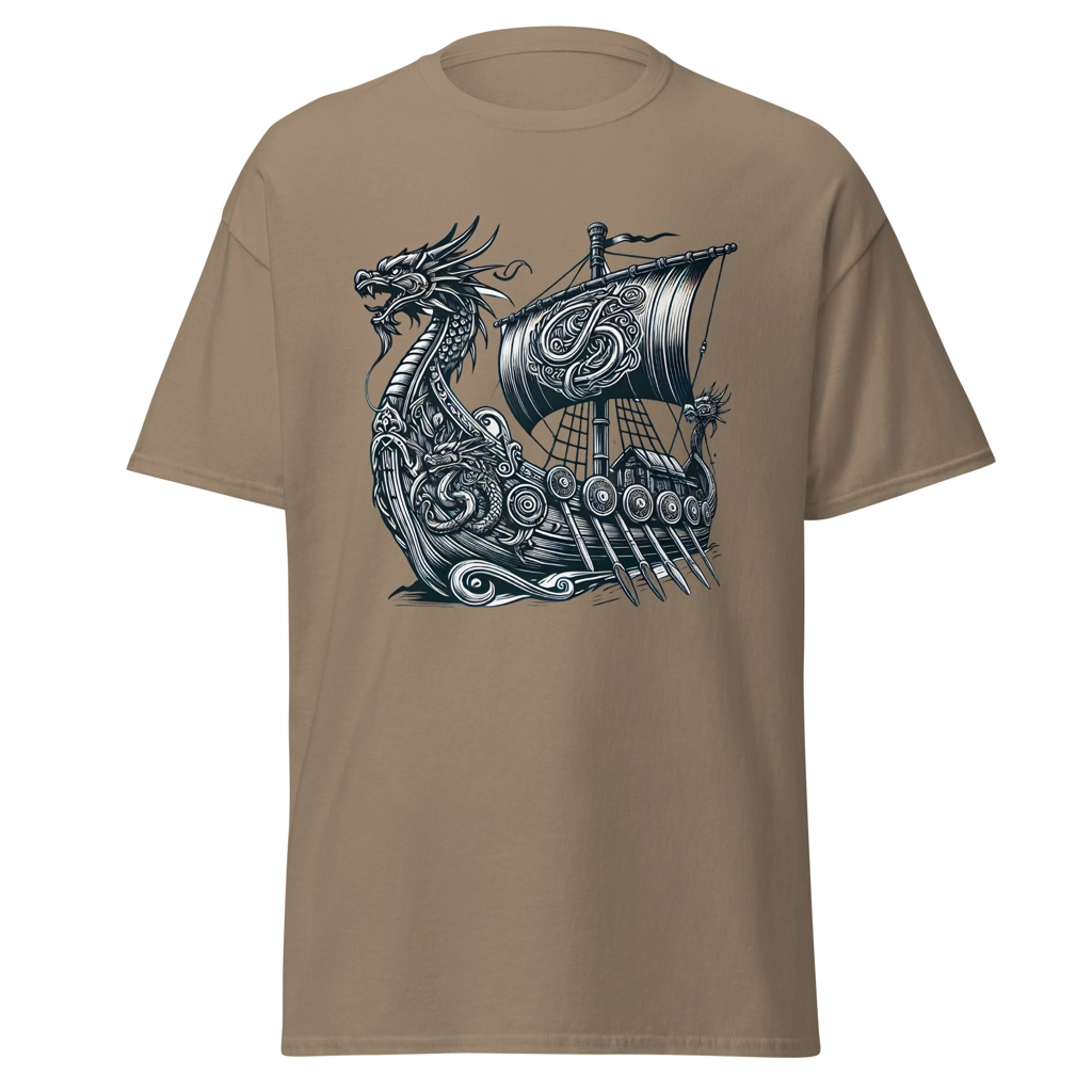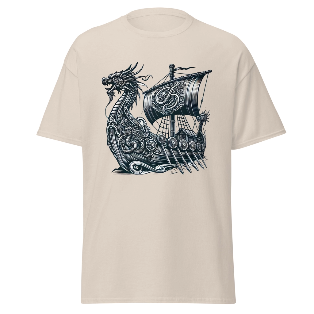 Luce el poder y la mística de la mitología nórdica con esta camiseta de edición especial que lleva un diseño imponente de un drakar vikingo, la legendaria embarcación de los exploradores escandinavos.