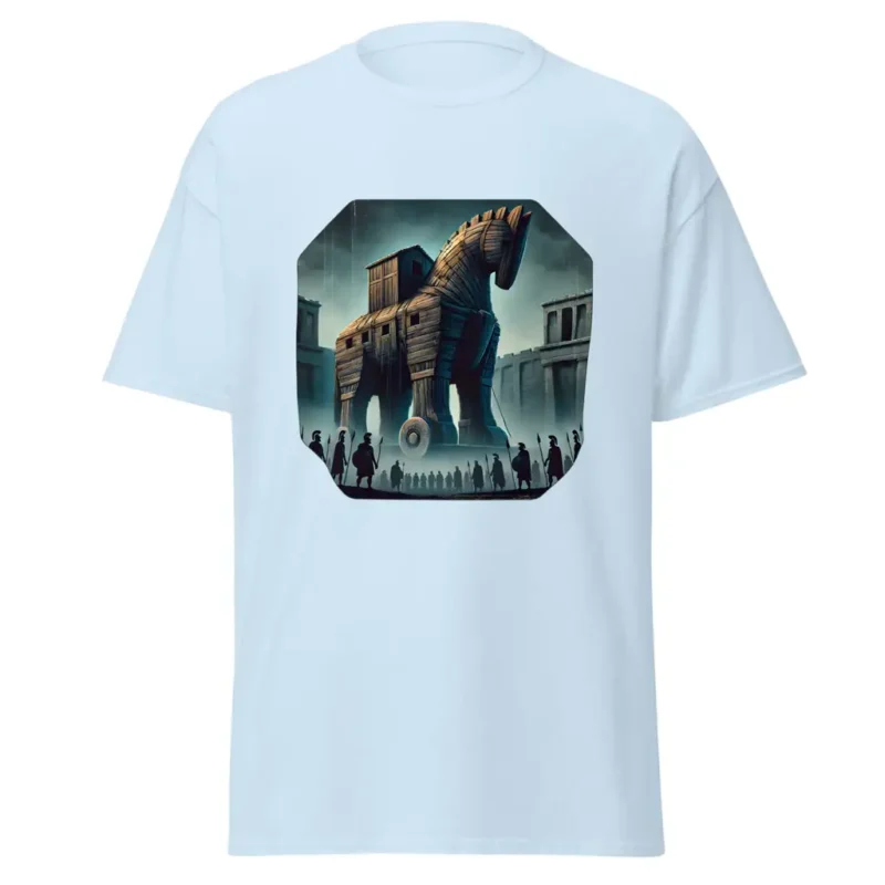 Camiseta de algodón suave y de alta calidad con un diseño impactante que evoca la historia del Caballo de Troya. En el centro de la prenda, se despliega una imagen detallada de un enorme caballo de madera, con texturas visibles y una escotilla ligeramente abierta, sugiriendo el peligro oculto. El entorno oscuro y brumoso destaca la silueta del caballo, mientras que las sombras de soldados griegos añaden un aire de misterio.