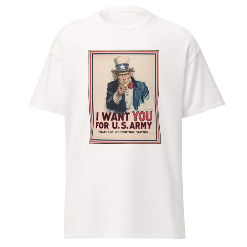 Esta camiseta presenta el diseño icónico del Tío Sam, el símbolo más reconocido del reclutamiento militar estadounidense. En el centro de la prenda, destaca la ilustración clásica de James Montgomery Flagg de 1917, donde el Tío Sam señala al espectador con determinación, acompañado del mensaje «I WANT YOU FOR U.S. ARMY», en una tipografía impactante y fácilmente reconocible.