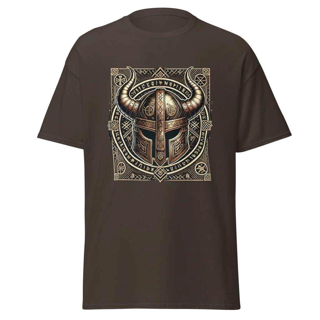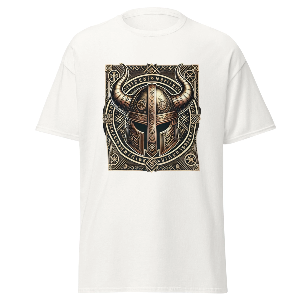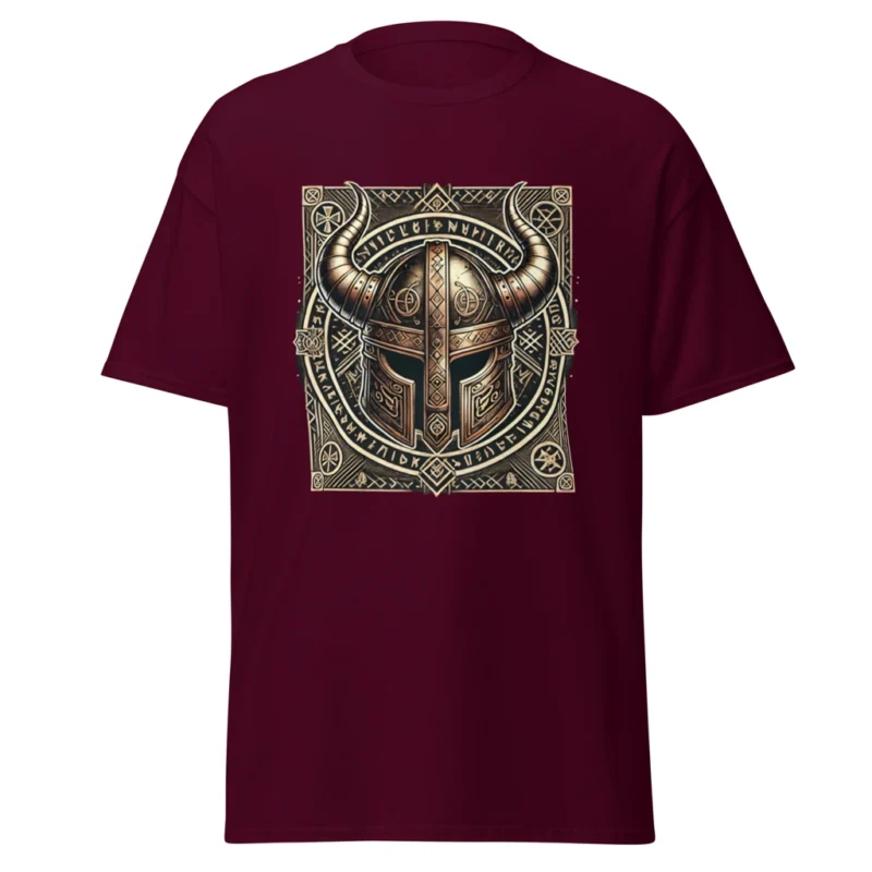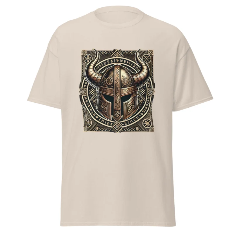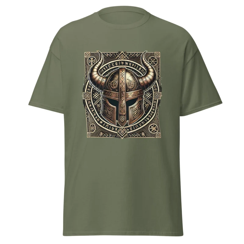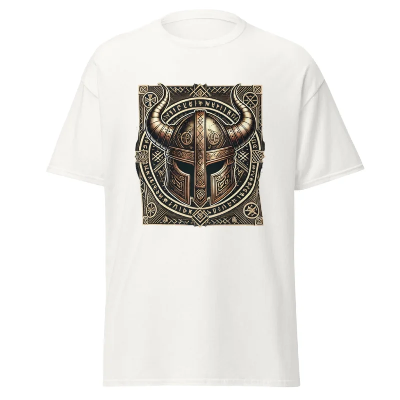 Sumérgete en la esencia de los antiguos guerreros con esta camiseta que rinde homenaje a la cultura vikinga. En el centro, se despliega un imponente casco vikingo, representado con una meticulosa atención al detalle que captura tanto el aspecto heroico como la historia de las tierras del norte.