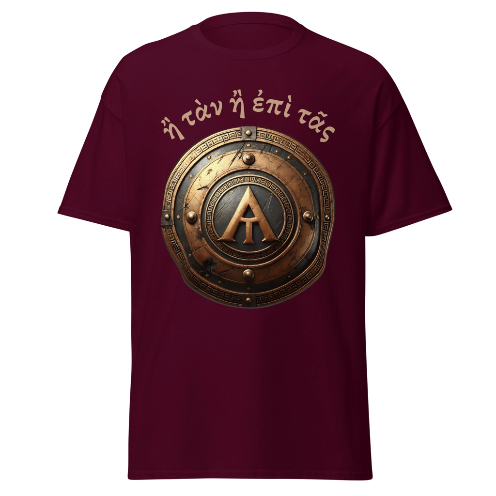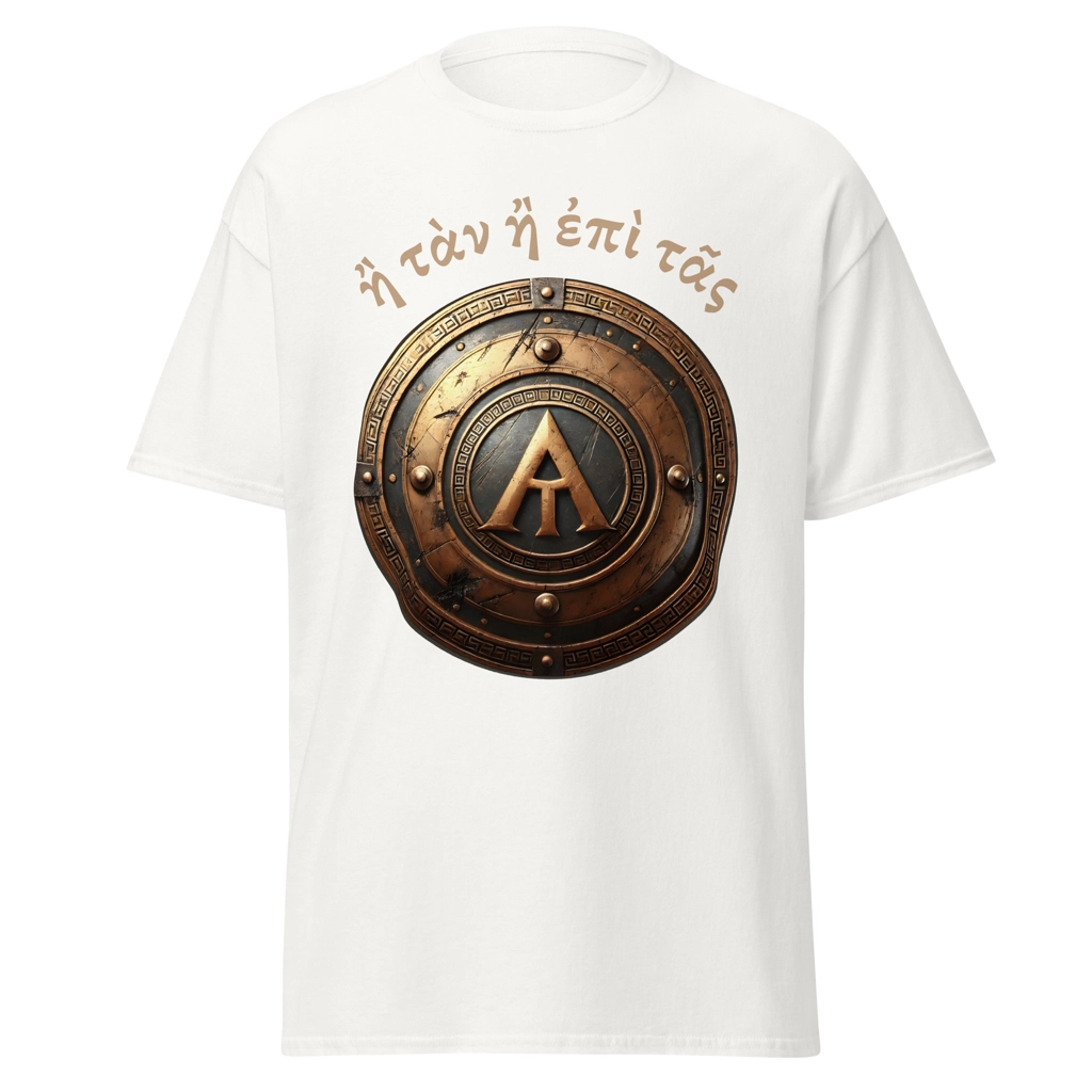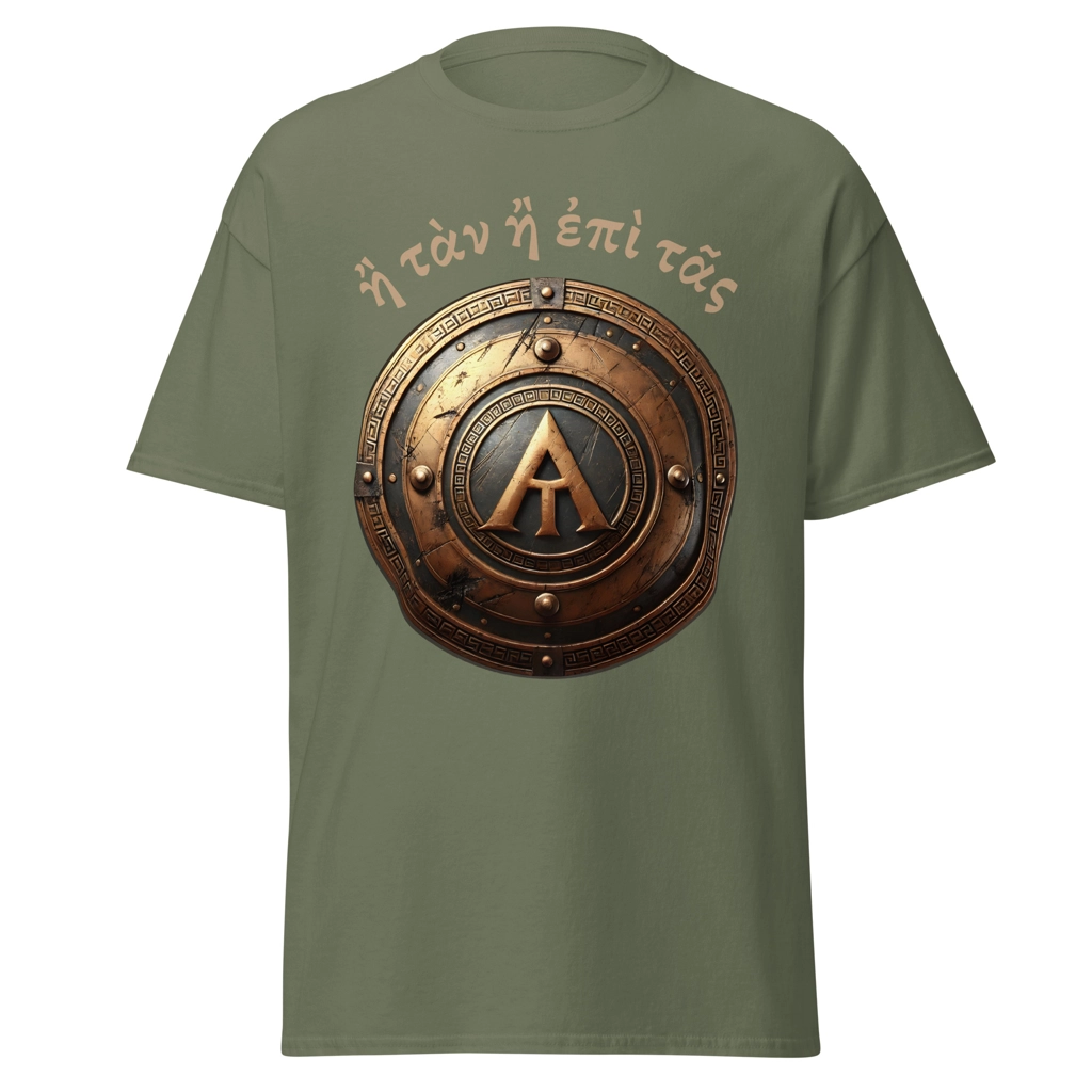 Regresar con el escudo significa regresar victorioso de la batalla, habiendo cumplido con el deber y conservando el honor. Regresar sobre el escudo alude a la muerte en combate, ya que los soldados caídos eran llevados de vuelta a Esparta sobre sus escudos, como una especie de camilla. Esta segunda opción también era vista con honor, ya que morir luchando era preferible a huir o rendirse.