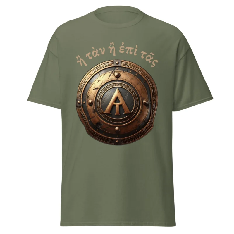 La frase «Regresa con el escudo o sobre él» es una traducción del dicho espartano «ἢ τὰν ἢ ἐπὶ τᾶς» y refleja uno de los ideales fundamentales de la cultura espartana: la valentía y el honor en la guerra.