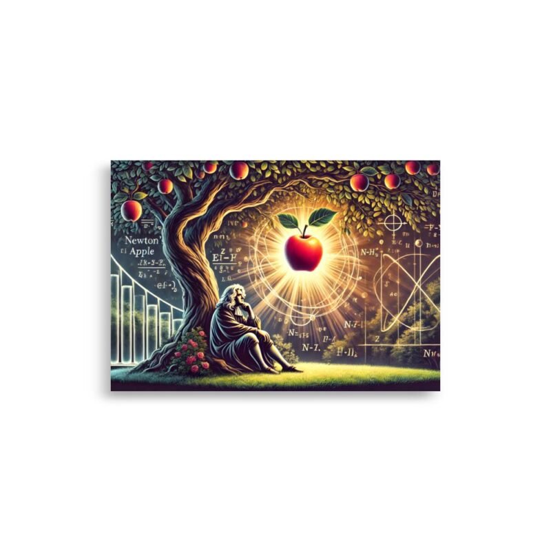 El póster presenta una ilustración vibrante y moderna que captura el icónico momento de inspiración de Isaac Newton bajo un árbol, con una manzana cayendo. La composición es rica en simbolismo, perfecta para estudiantes, científicos y amantes de la curiosidad intelectual.
