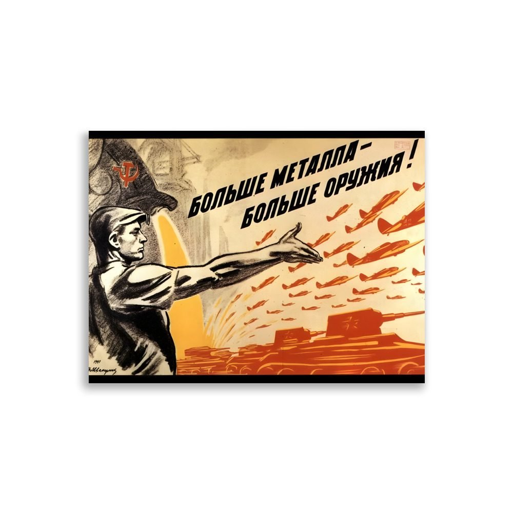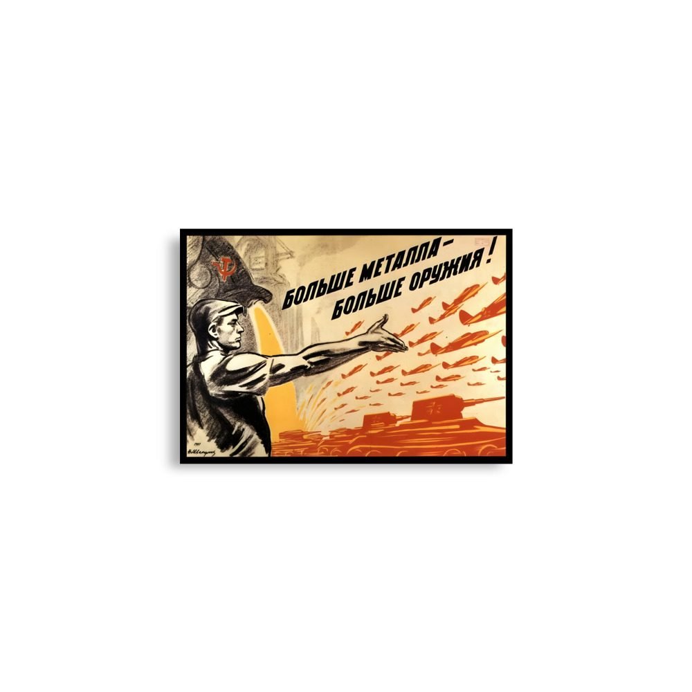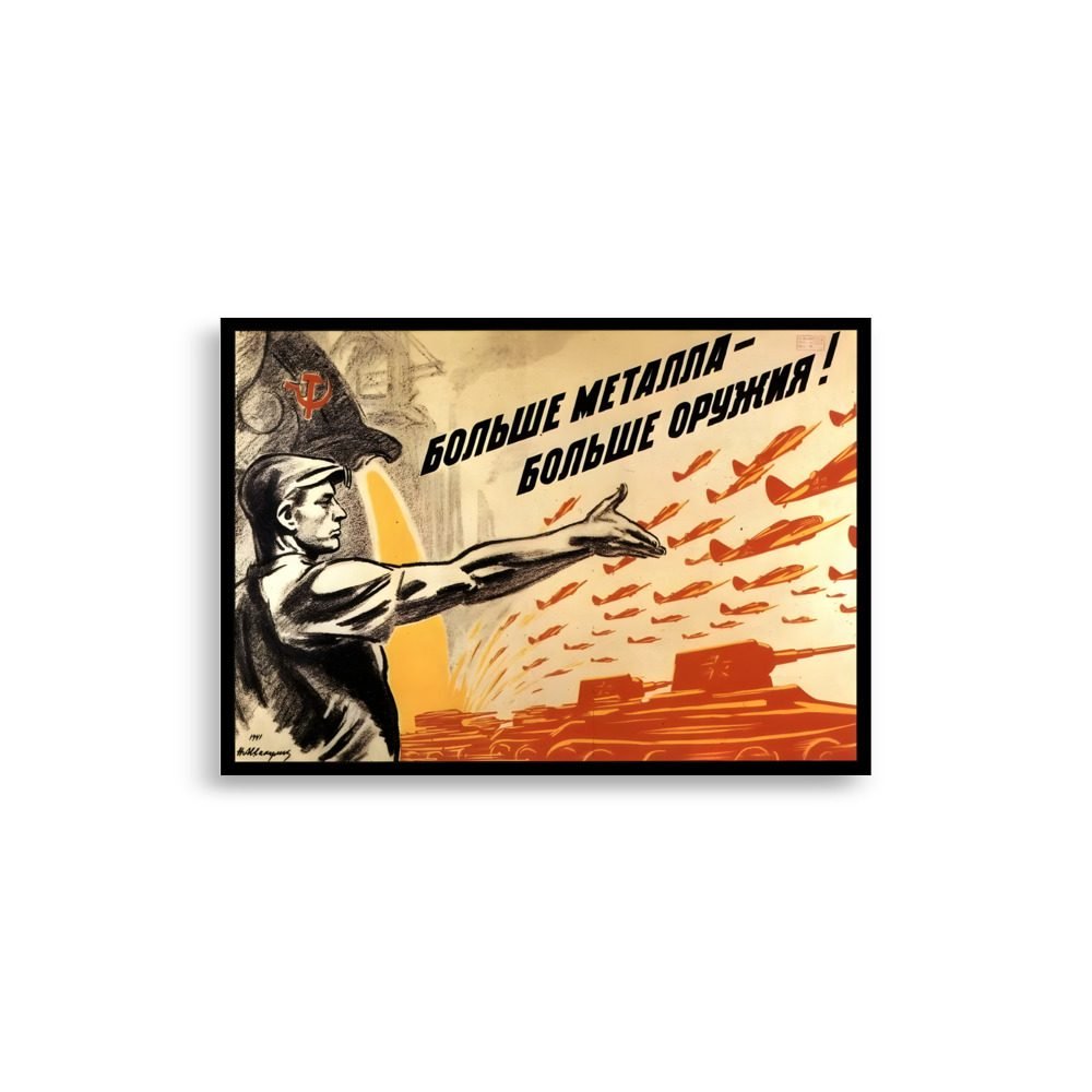 La frase que acompaña la imagen, «Más metal – más armas!», subraya la necesidad urgente de incrementar la producción de materiales bélicos para asegurar la defensa y el triunfo sobre el enemigo.