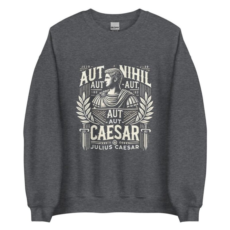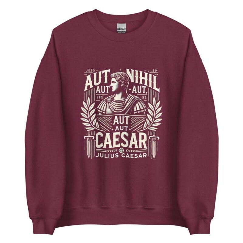 Esta sudadera presenta un diseño impactante inspirado en la grandeza de la Roma antigua. En el centro, la frase “Aut Caesar, Aut Nihil” se destaca en una elegante tipografía romana, evocando el poder y la determinación de Julio César. El diseño incluye detalles clásicos como coronas de laurel que simbolizan la victoria y el liderazgo, con sutiles iconos romanos como espadas o escudos, que aportan un toque de fuerza y carácter.