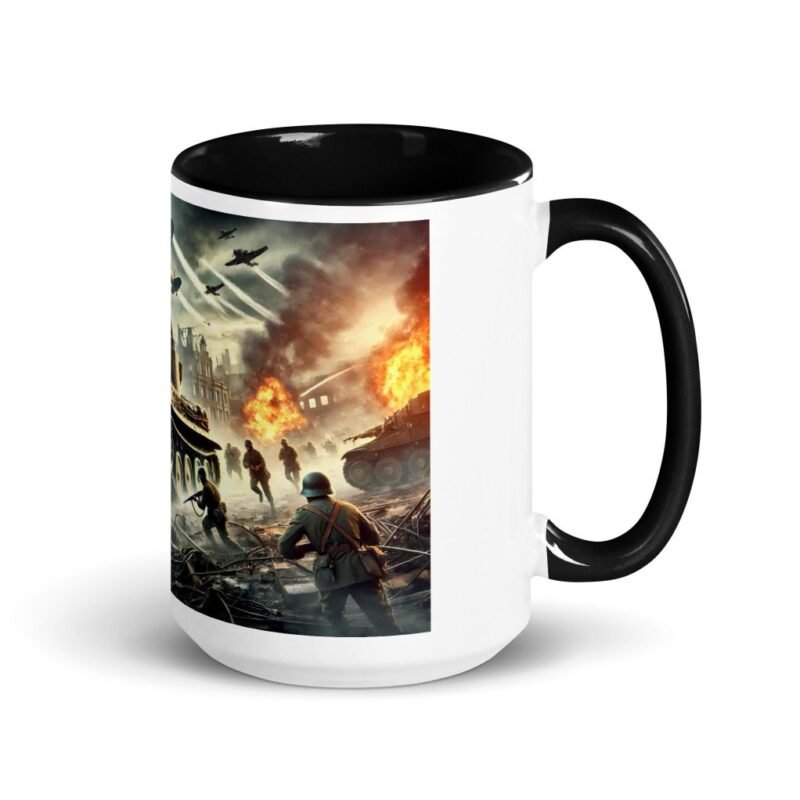 Imagina una tazacon una impactante escena de guerra plasmada en su superficie: la imagen captura el momento clave de una ofensiva militar, con tanques avanzando a toda velocidad mientras las explosiones iluminan el fondo, y aviones realizan incursiones aéreas. En el horizonte, se ven las ruinas de una ciudad, mostrando los efectos devastadores de la guerra total. Esta taza sería perfecta para quienes aprecian la historia militar, evocando la velocidad y el caos del Blitzkrieg de la Segunda Guerra Mundial. Ideal para añadir una dosis de intensidad a tu rutina diaria mientras tomas tu café o té.