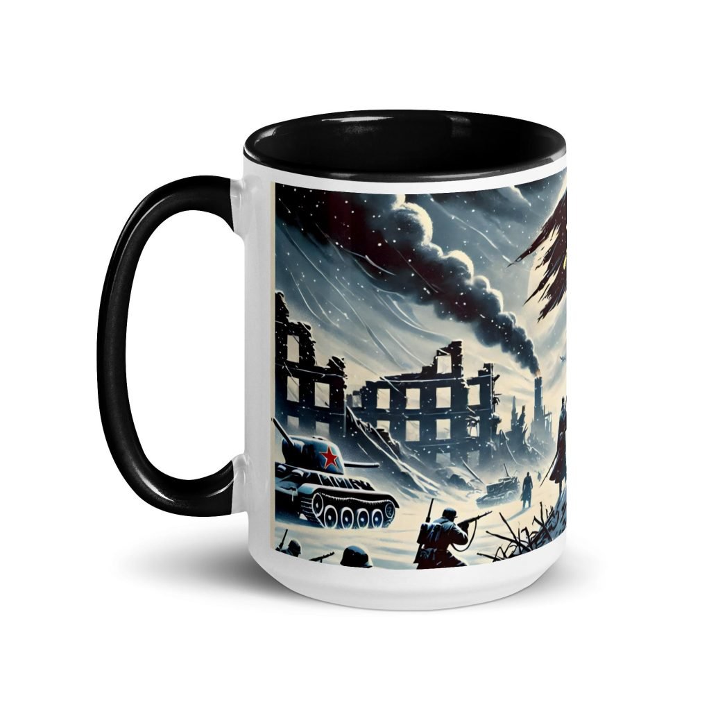 Taza conmemorativa de la Batalla de Stalingrado que lleva impreso el impactante diseño de la imagen anterior. La escena muestra la silueta de soldados en uniformes de invierno avanzando hacia una ciudad en ruinas, donde se alzan edificios destrozados y columnas de humo que se elevan hacia un cielo ominoso. En el centro de la imagen, destaca una bandera soviética desgarrada que ondea sobre los escombros, un símbolo de resistencia en medio del frío y la destrucción. La nieve que cae suavemente en contraste con los tonos oscuros del cielo y las sombras agrega un toque de serenidad a la cruda realidad de la guerra.