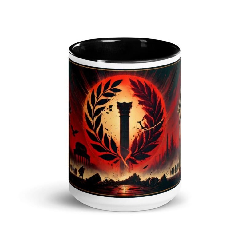 La paleta de colores es intensa y dramática, con tonos de rojo oscuro, negro, y dorados desvaídos que se entrelazan, creando un contraste visual impactante. Ideal para los amantes de la historia y la simbología, esta taza cuenta con un diseño cargado de significado, perfecto para aquellos que desean recordar la grandeza y la inevitable caída de una civilización.