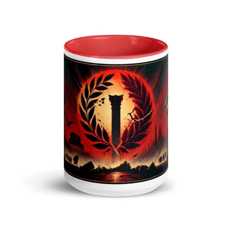 Imagina una taza que lleva la imagen de la caída del Imperio Romano como su tema principal. En el exterior de la taza, se despliega un paisaje sombrío con un cielo teñido de rojo sangre, simbolizando el ocaso de una era. En el centro de la imagen, un gigantesco laurel romano, fracturado y roto, flota en el aire, emitiendo un tenue resplandor dorado que se desvanece, recordando la gloria perdida.