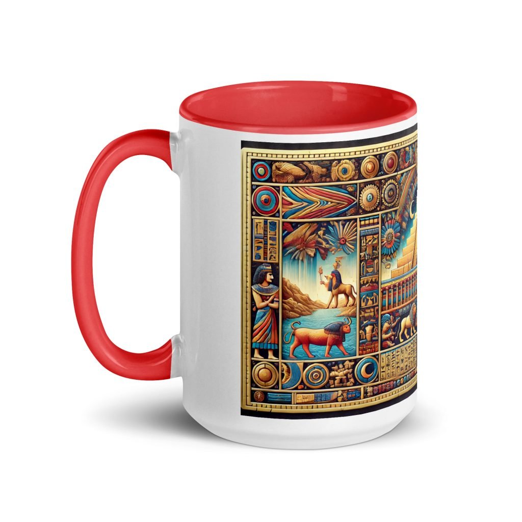 Esta taza única presenta un diseño vibrante inspirado en la antigua cultura sumeria. El diseño envuelve la superficie de la taza, mostrando una composición rica en detalles: un majestuoso zigurat, escritura cuneiforme, símbolos icónicos como el toro y la luna creciente, y representaciones de deidades mesopotámicas.