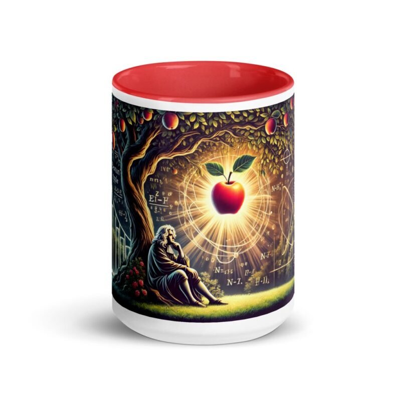 Taza de cerámica blanca de alta calidad con un diseño llamativo y elegante. La ilustración en la taza muestra una escena vibrante y detallada de la manzana de Newton cayendo del árbol, un momento emblemático de la ciencia y la inspiración.